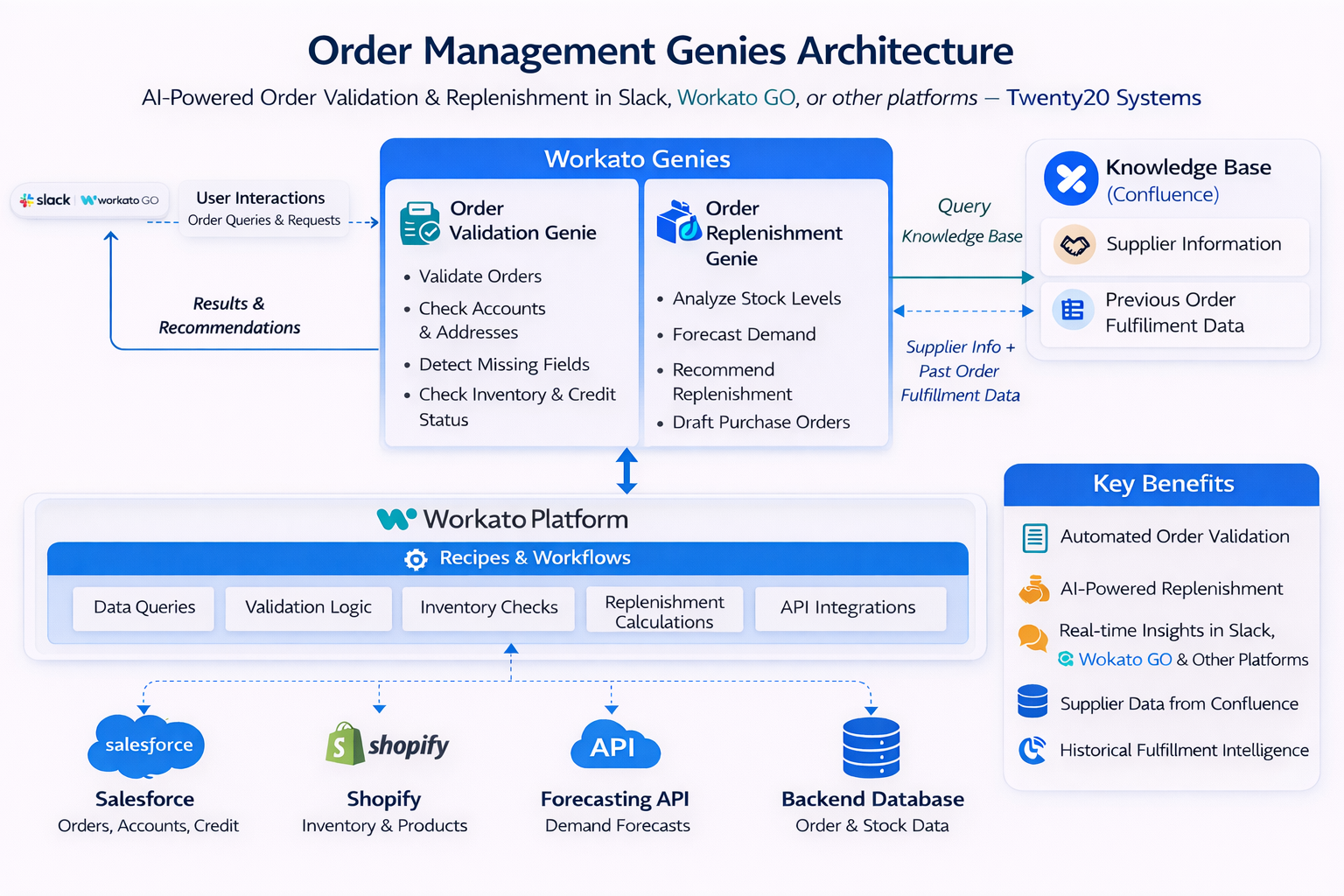 Order Management Geniesは、Workatoを基盤としたAI搭載の対話型自動化ソリューションであり、サプライチェーンおよびオペレーションチームがSlack、Workato GO、またはその他の対話型コラボレーションプラットフォーム内で、注文の検証と在庫補充を直接管理するのに役立ちます。
