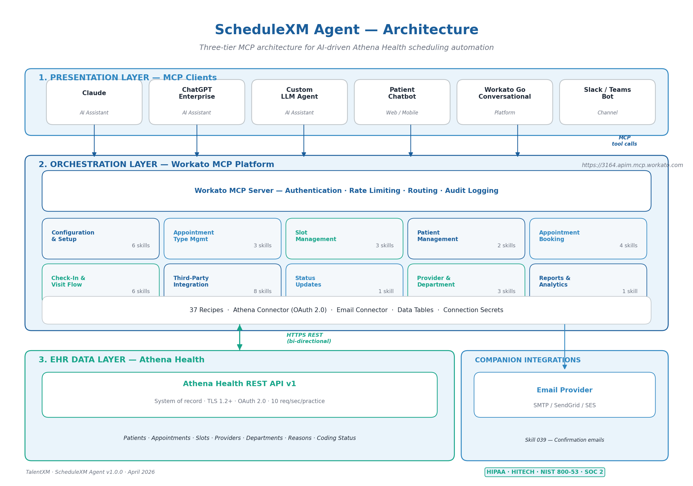 ScheduleXM Agentは、医療予約スケジューリングを、手作業が多く、エラーが発生しやすく、電話対応が中心だったワークフローから、AIを活用した対話型のエクスペリエンスへと変革します。Workato MCPプラットフォーム上に構築され、Athena Healthとネイティブに統合されたこのエージェントは、患者から予約までのライフサイクル全体を網羅する37の個別のスキルを提供します。具体的には、構成検索、スロット管理、患者作成、予約の登録と変更、チェックインとチェックアウトの流れ、サードパーティのコーディング統合、確認ステータスの更新、医療提供者と部門の検索、レポート作成などが含まれます。