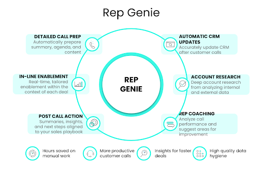 Rep Genie는 영업팀을 위한 AI 에이전트로, 수작업을 줄이고 영업 주기 전반에 걸쳐 실시간으로 상황에 맞는 데이터 기반 가이드와 지원을 제공하여 거래 속도를 높이고 수주율을 향상시켜 팀이 더 빠르고 효과적으로 거래를 성사시킬 수 있도록 돕습니다.